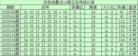大小走势分析:上期开出大小比为3:3,上周日红球大小比5:1,最近十周日大号红球发扬占优,本期瞻望大小红球走势均衡,参考大小比3:3。