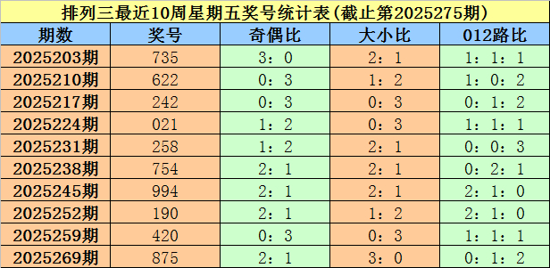 胪列三第2025269期(上周星期五)奖号为875。其中奖号奇偶比为2:1,大小比为3:0,012路比为0:1:2。